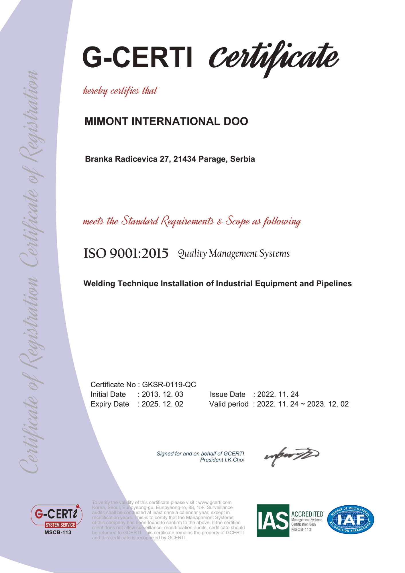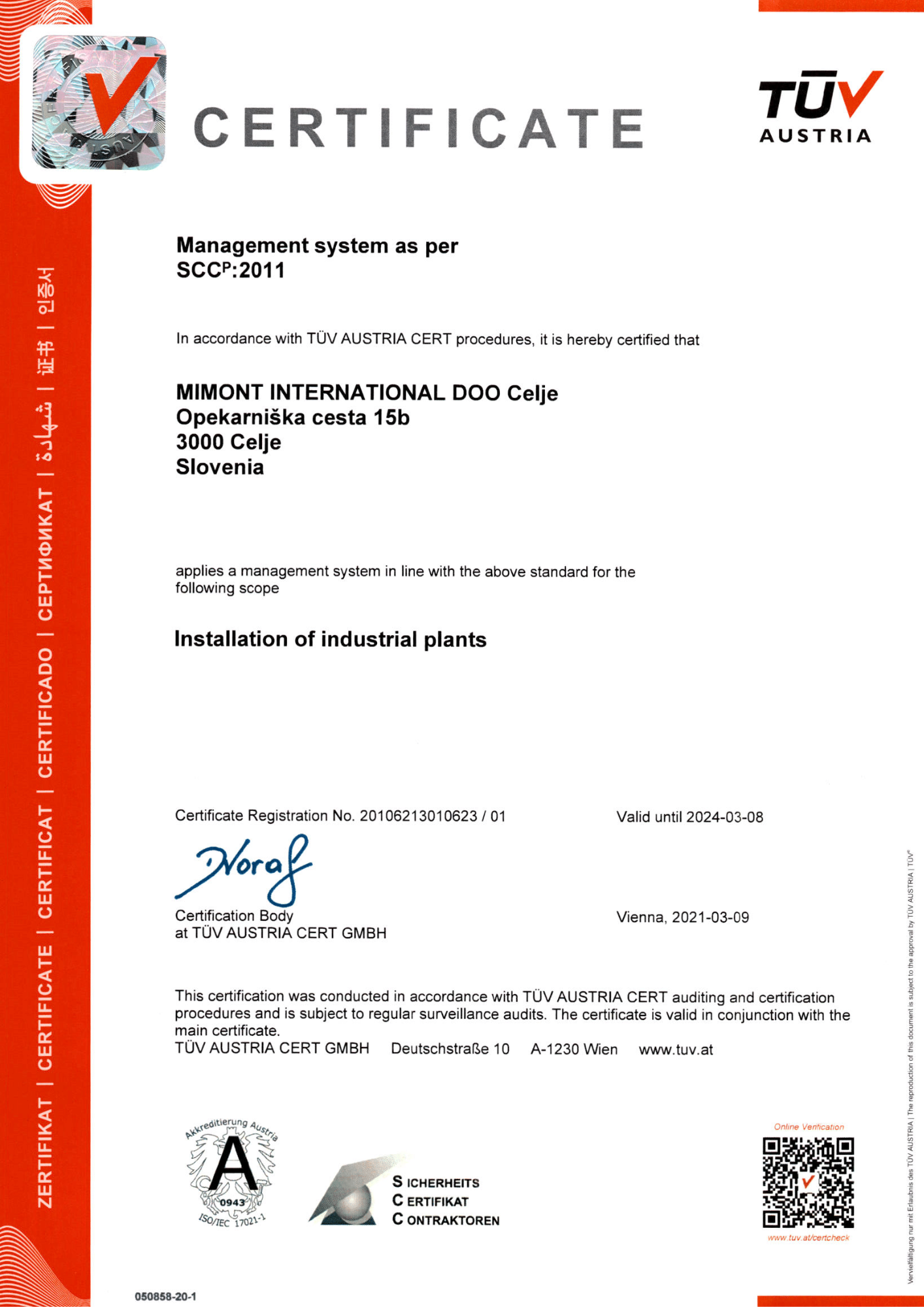 Mimont International verfügt über SCC-Zertifikate sowie den ISO-9001-Standard in allen Ländern mit eigenen Repräsentanzen.